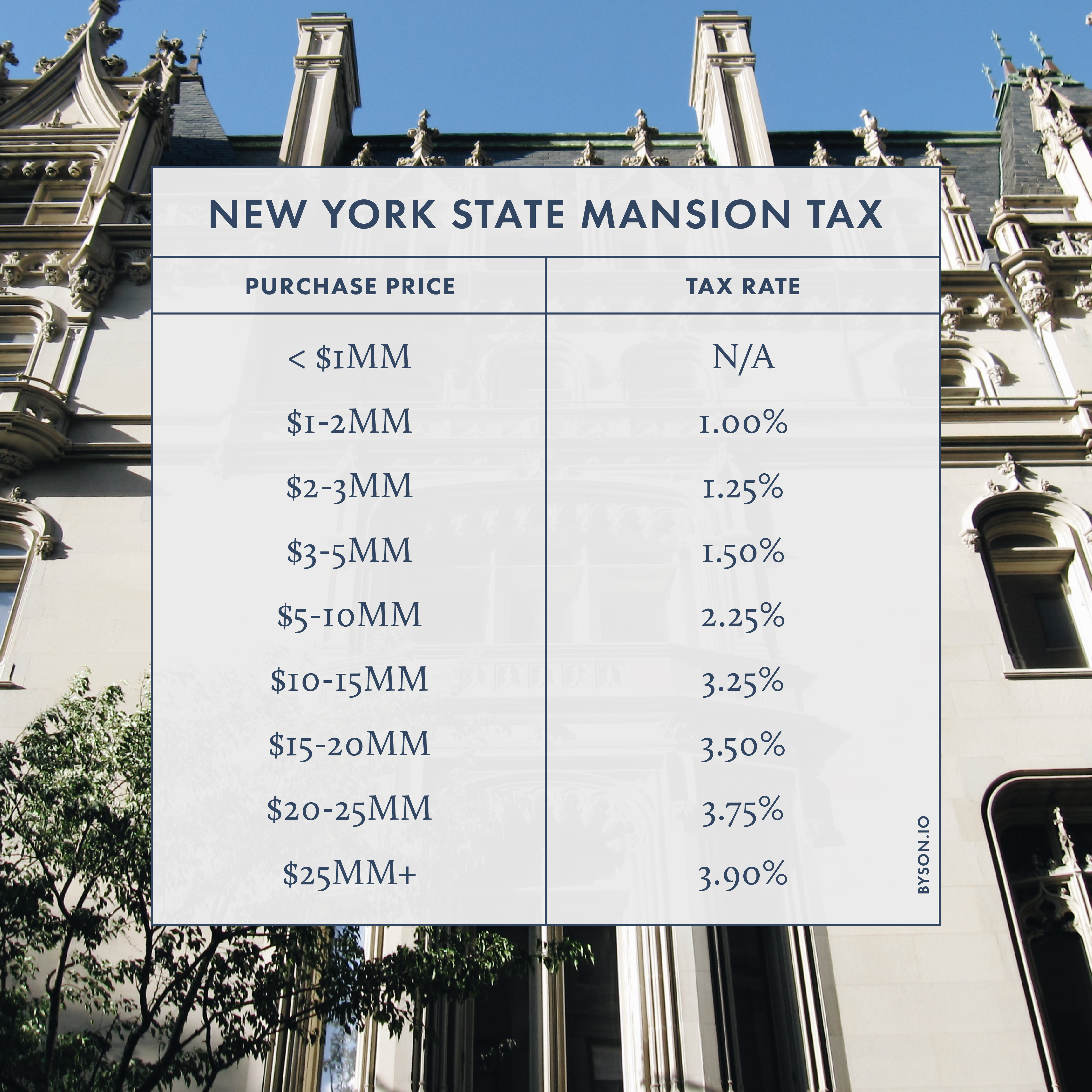 Originally instituted by Governor Mario Cuomo in 1989 at a flat rate of 1%, the Mansion Tax remained unchanged for more than 30 years. In the 2020 State Budget, it was transitioned to a progressive tax, with rates ranging from 1% to 3.9%, depending on the purchase price: